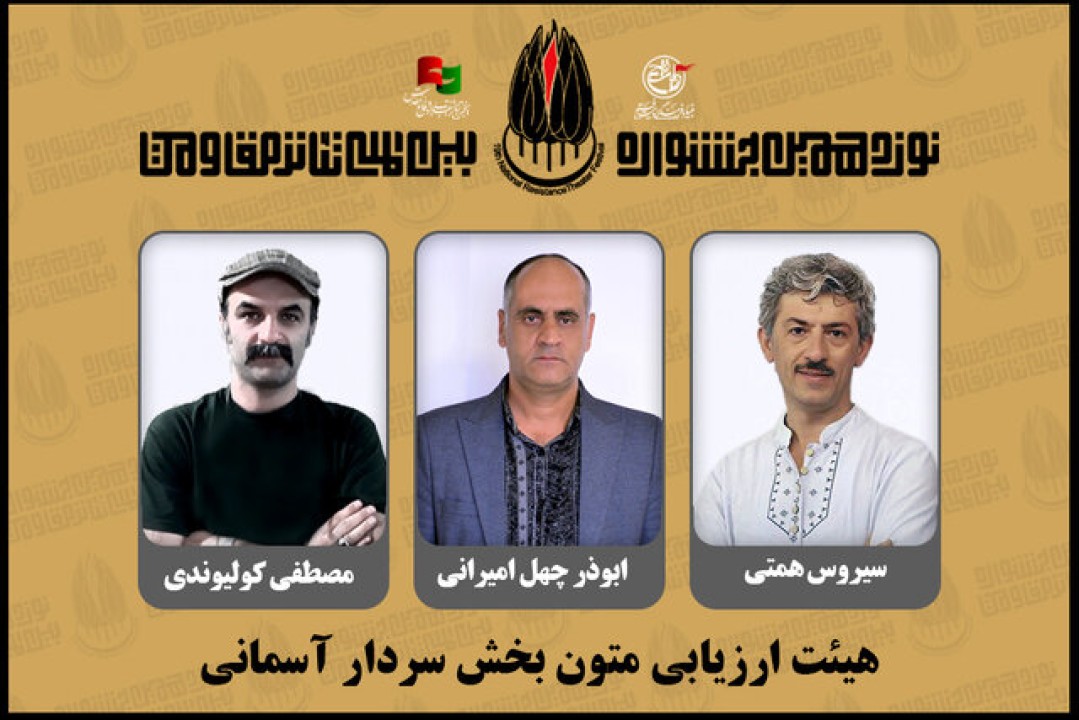 براساس این گزارش، سیروس همتی نویسنده، کارگردان و بازیگر تئاتر، سینما و تلویزیون، ابوذر چهل امیرانی نویسنده، کارگردان و بازیگر نمایشهای خیابانی ، مصطفی کولیوندی نویسنده، کارگردان و بازیگر نمایشهای خیابانی به عنوان هیئت ارزیابی متون بخش «سردار آسمانی» نوزدهمین جشنواره بین المللی تئاتر مقاومت معرفی شده اند.
